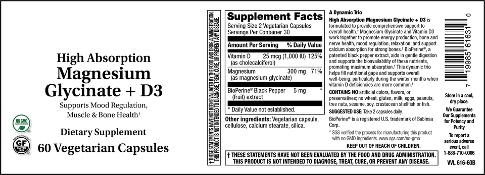 Daily intake of Magnesium (Mg) is 420mg for men and 320mg for women. However, recent reports estimate that many Americans do not consume the recommended daily amount of Mg. Part of the problem stems from the soil used for agriculture, which is becoming increasingly deficient in essential minerals. Moreover, the Western diet contains more refined grains and processed food. Estimates are that 80–90% of Mg is lost during food processing. Vitamin D is often obtained from sunlight or liver and fatty fish. Most vitamin D from plants is in the form of Vitamin D2 and must be converted to D3 in the body. This product combines two of our best sellers and includes BioPerine®, a natural extract known for supporting