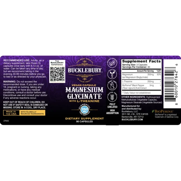 Superior Magnesium Absorption – Our Magnesium Glycinate with L-Theanine capsules provides 350 mg of elemental magnesium per three-capsule dose, ensuring optimal absorption and benefits. L-Theanine for Calm Focus – Each dose also includes 200 mg of L-Theanine, a natural amino acid known for promoting a sense of calm and mental clarity. Vegan and All-Natural – Our 90 vegan capsules are made from the finest, all-natural ingredients, suitable for a vegan lifestyle. Relax and Rejuvenate – Experience relaxation and rejuvenation with our potent magnesium and L-Theanine formula, perfect for stress relief and a balanced mood. Trusted by Customers – Join the ranks of satisfied customers who trust Bucklebury Magnesium Glycinate with L-Theanine for their relaxation and focus needs.