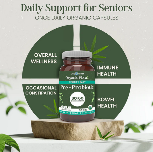 Senior’s Daily is a simple way to start supporting your gut and immune health with 30 Billion probiotic cells, 60 unique probiotic strains, and an organic prebiotic mushroom blend all in one daily organic capsule that’s tailored for seniors with a higher Bifidobacterium to Lactobacillus ratio to support colon health and regularity.